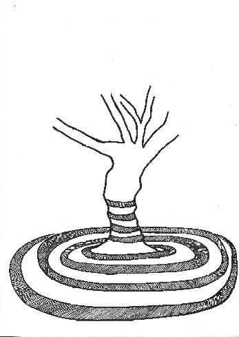 至於植物氣場內的螺旋力,海克斯汀(Haxeltine)指出探測師們通常發現樹的氣場內有多個能量帶。大家描述說是二維空間的能量帶環繞著樹木周圍也有說是垂直沿著樹幹螺旋上升的螺旋式能量帶。這些環帶的強度和大小似乎是由樹的年齡、大小、季節和健康來決定。 一棵樹周圍可以探測出多少能量帶呢?薩滿師彼德•阿吉茲談到感知一棵大樹的氣場,「會有四層,各相距幾英尺,樹皮內有第五層。」想像上這第五層就是那順著樹幹垂直旋轉上下的能量帶。如圖1所示。當然這會是個很容易用探測確認的事,是這樣嗎? 圖1 探測得出的樹螺旋